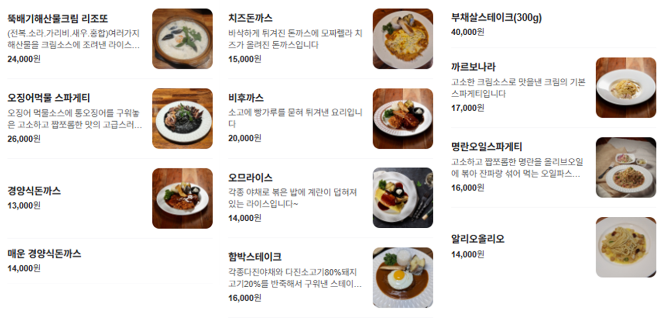 대표메뉴 경양식 돈까스, 함박스테이크, 크림 파스타