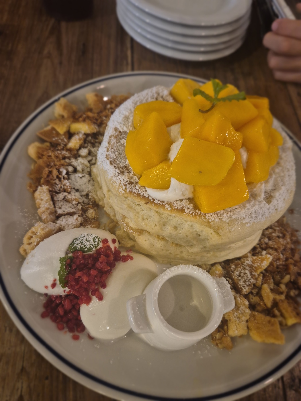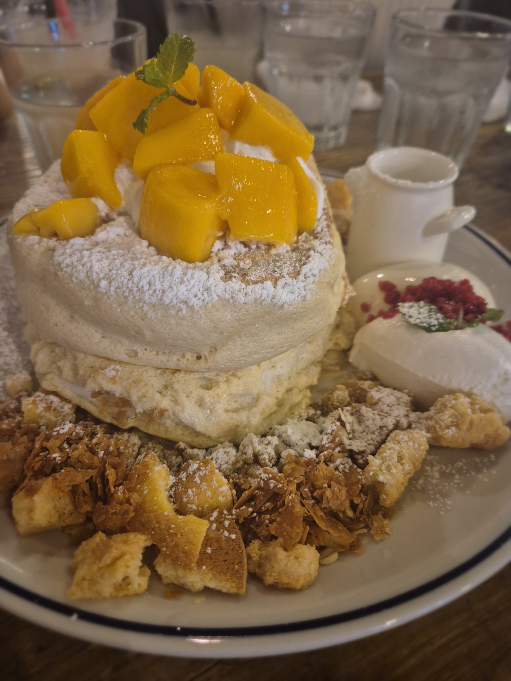 부드럽고 폭신한 일본식 수플레 팬케이크와 신선한 망고의 조화는 후쿠오카 여행의 달콤한 하이라이트가 될 거예요.