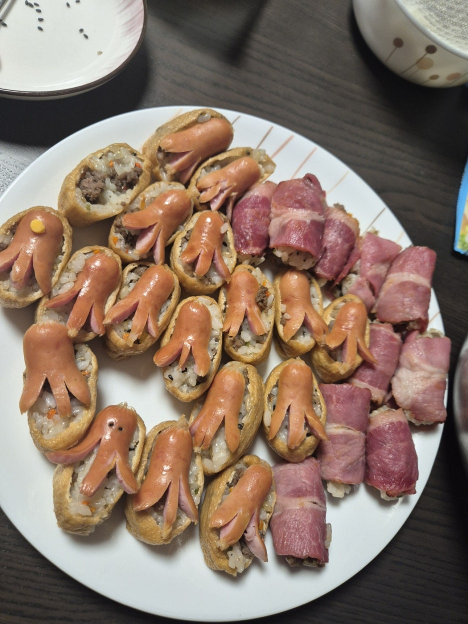 먼저 준비한 건 문어소시지 유부초밥이었습니다. 달콤한 유부 주머니 안에 고슬고슬한 밥을 채우고, 그 위에 문어 모양으로 칼집 낸 소시지를 얹었습니다. 다리 모양이 자연스럽게 퍼지며 귀여운 문어로 변신하니, 아이가 옆에서 “엄마, 진짜 문어 같다!”며 신기해했습니다. 이 날은 우리딸도 새벽부터 일어나서 나도 시나모롤 김밥을 만들겠다며 새벽 4시부터 일어나 몇번을 다시 자라고 재우고 했던거 같아요.