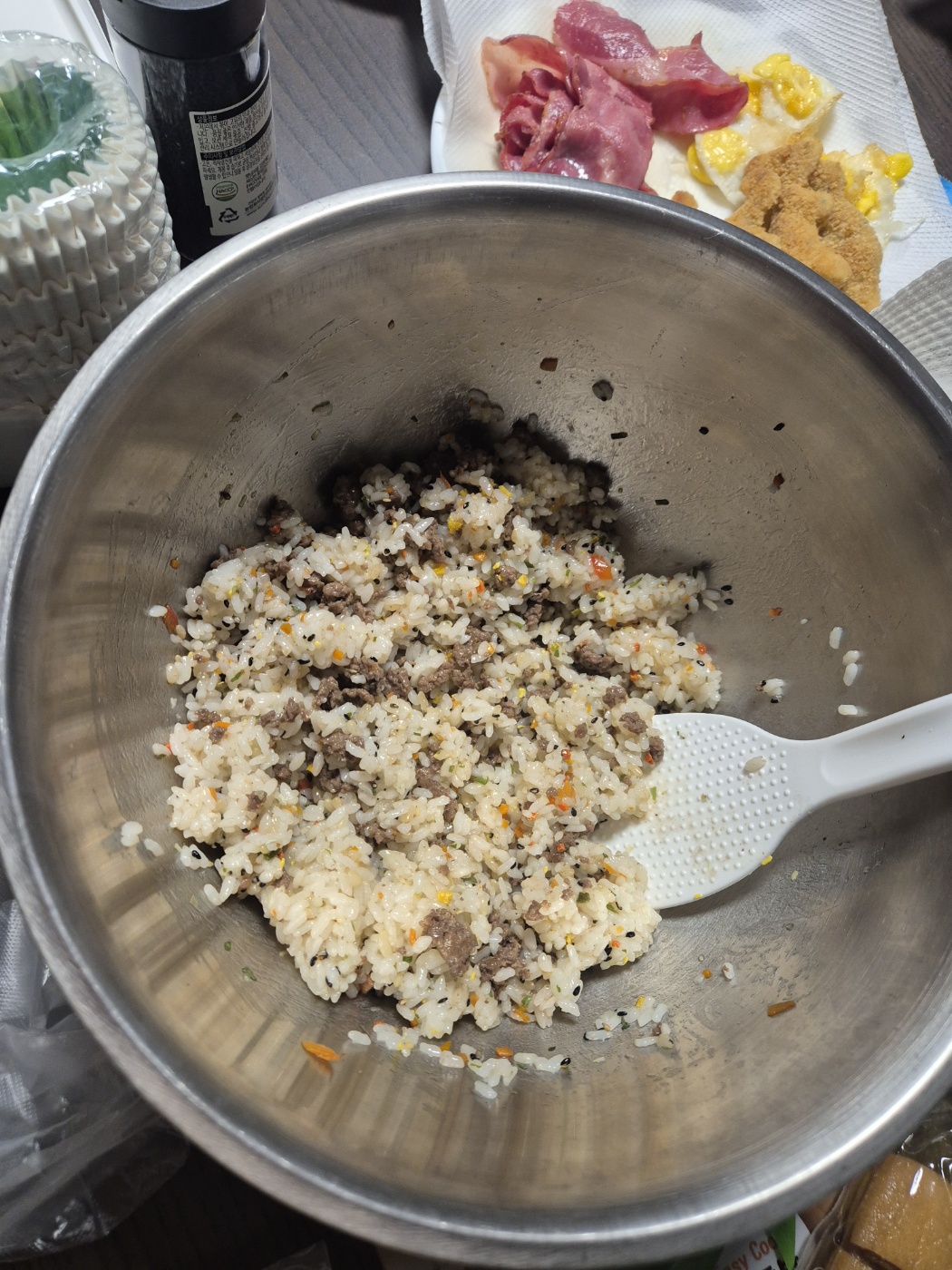 두 번째 메뉴는 베이컨말이밥이었습니다. 초밥으로 만든 밥에, 미리 구워놓은 베이컨으로 돌돌 감싸 주었습니다. 베이컨이 노릇하게 익으며 고소한 향이 퍼지자 아이가 “이건 내가 제일 먼저 먹을 거야!”라며 군침을 삼켰습니다. 베이컨의 짭조름함과 밥의 담백함이 어우러져 소풍 도시락에서 가장 든든한 주 메뉴가 되었습니다. 친구들과 나누어 먹기에도 좋은 메뉴였어요.