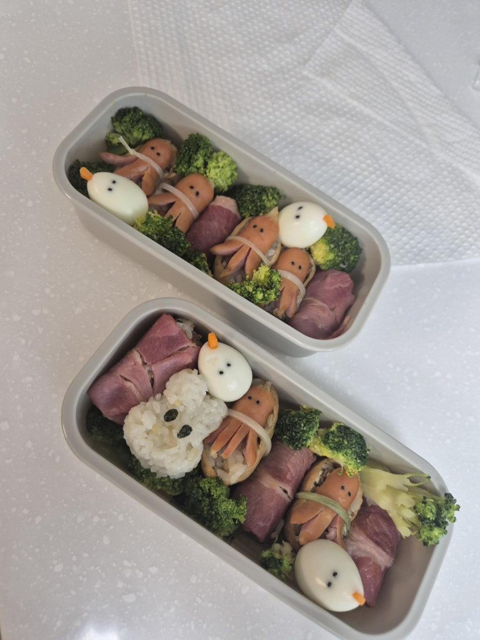 오늘 준비한 도시락은 단순히 밥과 반찬의 조합이 아니라, 정성과 창의력이 담긴 작은 예술 작품이었습니다. 문어소시지의 유쾌함, 베이컨말이밥의 든든함, 병아리 메추리알의 귀여움이 어우러져 도시락은 하나의 무대처럼 빛났습니다. 밥 중간중간 냉동 브로콜리 삶아서 데코를 해주고(쿠팡에 브로컬리 재고 없어서 냉동 브로컬리 구매했어요.) 또 병아리 메츄리알과 우리딸이 만든 토끼 주먹밥으로 도시락을 완성 했어요.